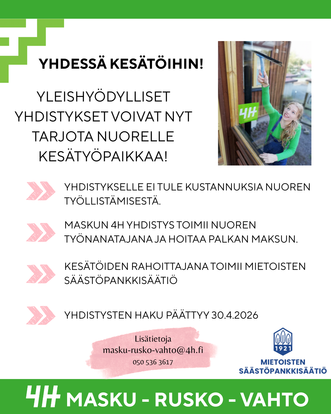 Työllistävällä yhdistyksellä voi olla tiedossaan sopiva nuori, joka tehtävään palkataan. Myös Maskun 4H-yhdistys voi oman kesätyöhakunsa kautta etsiä työtehtäviinne sopivan nuoren.